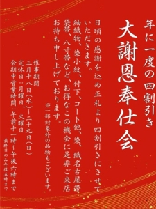 年に一度の四割引き~大謝恩奉仕会 カテゴリー : むら田祇園店 | 投稿日 : 2026年3月8日 ツイート 「祇園むら田」では3月18日(水)から3月29日(日)まで <年に一度の四割引き 大謝恩奉仕会>を開催いたします👘 皆さまのお越しをお待ち申し上げております ・ ・ (催事中の月曜日、火曜日は定休日となります) 日頃の感謝を込め、正札より四割引きでご奉仕させていただきます🌱 (長襦袢、小物、反物、加工など一部対象外商品ございます)