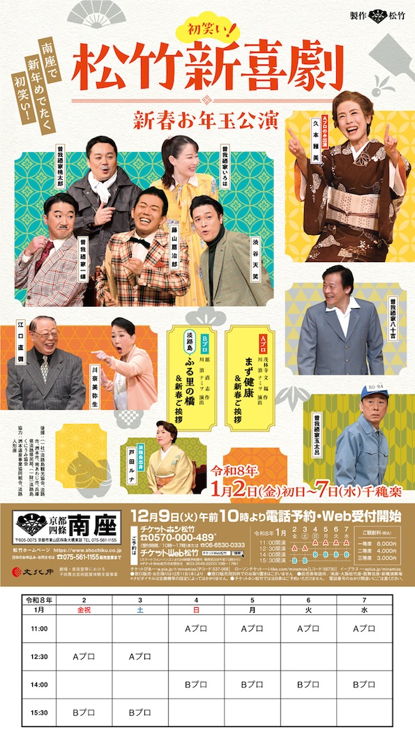 南座 初笑い!松竹新喜劇 新春お年玉公演 1月2日~7日 カテゴリー : イベント情報 | 投稿日 : 2025年12月27日 ツイート 2026年1月2日(金)~7日(水) 南座 南座のお正月恒例の喜劇公演!! 初詣のお帰りにどうぞ!! 【演目】Aプロ:まず健康&新春ご挨拶 Bプロ:淡路島 ふる里の橋&新春ご挨拶 【出演】藤山扇治郎、渋谷天笑、曽我廼家一蝶、曽我廼家いろは、曽我廼家桃太郎 曽我廼家八十吉、曽我廼家玉太呂、江口直彌、川奈美弥生、戸田ルナ ゲスト:久本雅美(Aプロのみ) 【料金(税込)】一等席8,000円 二等席4,000円 三等席 3,000円 【問合せ】TEL/075-561-1155 (南座)