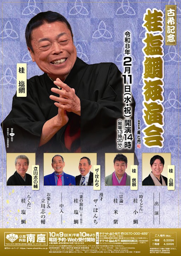 南座 古希記念 桂塩鯛独演会 2月11日 カテゴリー : イベント情報 | 投稿日 : 2026年2月5日 ツイート 2026年2月11日(水・祝) 南座 芸歴48年、桂塩鯛の円熟した話芸をお楽しみください! 【出演】桂塩鯛、立川志の輔、ザ・ぼんち、桂米紫、桂小鯛 【料金(税込)】一等席6,500円 二等席4,500円 【問合せ】TEL/075-561-1155 (南座)