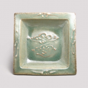 柔らかな青緑色の釉薬が全体を包み込み、見込みには意匠化された花文が陰刻されて