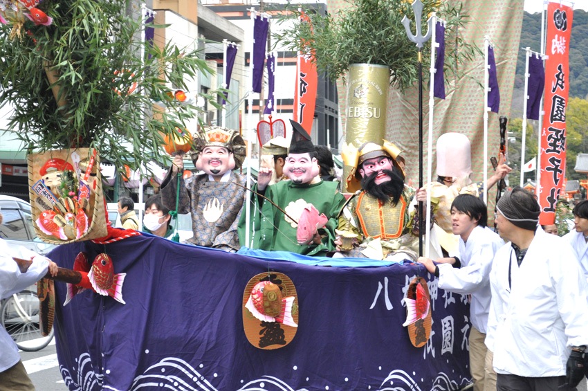 9日には神賑行事、蛭子船(えびすふね)を巡行します。祇園太鼓が賑やかに囃子を打ち鳴らし、華やかな福娘に先導され、えべっさんのブロンズ像を載せた山車や七福神が乗り込んだ宝船が巡行します。